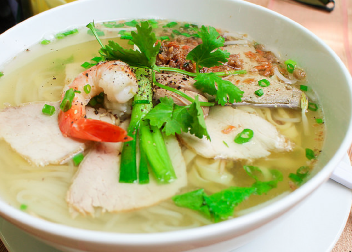 Le Hủ Tiếu 猪肉粿条 est un plat d'origine vietnamienne (et Sud de Chine), une sorte de grand bol, composé de pâte au riz blanche accompagnée de scampis, porc laqué et boulettes de porc spéciales faites Maison, dans le bouillon délicieusement préparé pendant des heures.