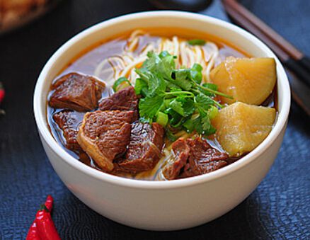 Le Niu-Nan Mian 牛腩汤面 est une spécialité d'origine cantonaise (Chine), une sorte de grand bol, composé de nouilles accompagnées de bœuf braisé très tendre, avec son jus délicieusement préparé aux légumes et poivre pendant des heures.
